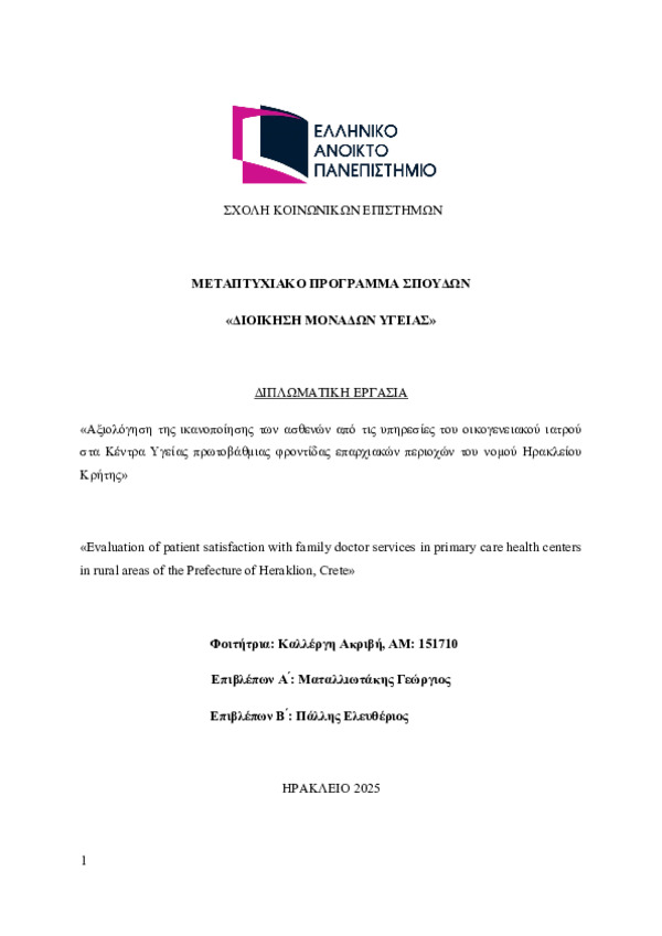 Evaluation of patient satisfaction with family doctor services in primary care health centers in rural areas of the Prefecture of Heraklion, Crete (Αγγλική)