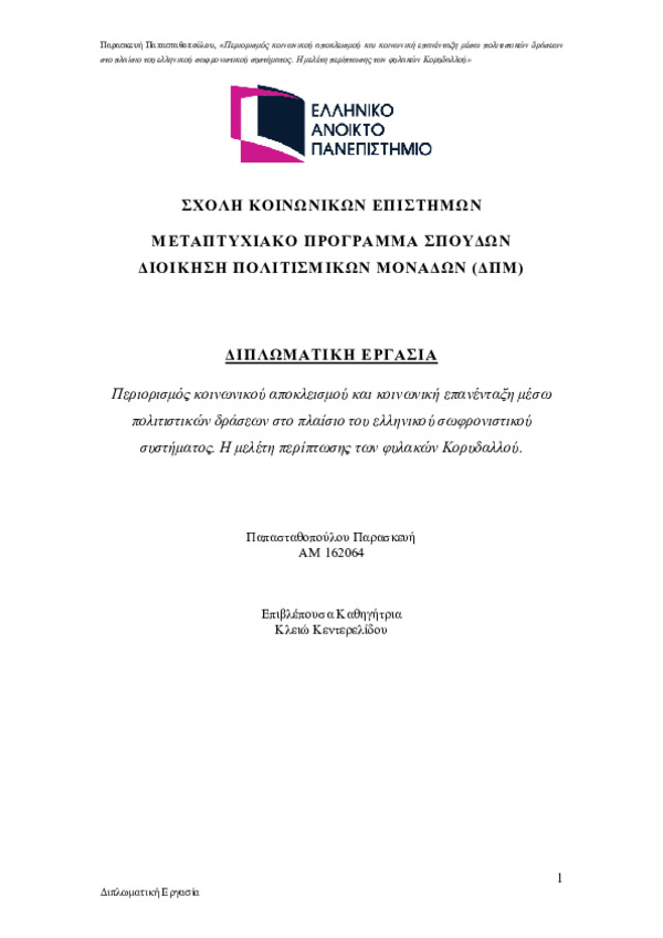 Περιορισμός κοινωνικού αποκλεισμού και κοινωνική επανένταξη μέσω πολιτιστικών δράσεων στo πλαίσιo του ελληνικού σωφρονιστικού συστήματος. Η μελέτη περίπτωσης των φυλακών Κορυδαλλού. - Identifier: 229933