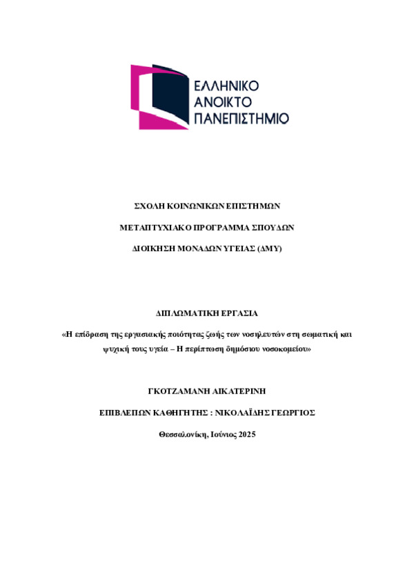The impact of nurses' quality of work life on their physical and mental health- The case of a public hospital (Αγγλική)