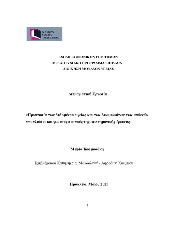 Η παρούσα μελέτη ασχολείται με το ζήτημα της προστασίας των δεδομένων υγείας και των δικαιωμάτων των ασθενών, στο πλαίσιο και για τους σκοπούς της επιστημονικής έρευνας.