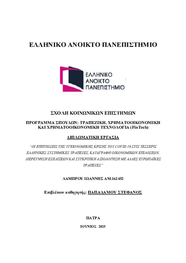 ΟΙ ΕΠΙΠΤΩΣΕΙΣ ΤΗΣ ΥΓΕΙΟΝΟΜΙΚΗΣ ΚΡΙΣΗΣ ΤΟΥ COVID 19 ΣΤΙΣ ΤΕΣΣΕΡΙΣ EΛΛΗΝΙΚΕΣ ΣΥΣΤΗΜΙΚΕΣ ΤΡΑΠΕΖΕΣ, ΚΑΤΑΓΡΑΦΗ ΟΙΚΟΝΟΜΙΚΩΝ ΕΠΙΔΟΣΕΩΝ, ΔΙΕΡΕΥΝΗΣΗ ΕΞΕΛΙΞΕΩΝ ΚΑΙ ΣΥΓΚΡΙΤΙΚΗ ΑΞΙΟΛΟΓΗΣΗ ΜΕ ΑΛΛΕΣ ΕΥΡΩΠΑΪΚΕΣ ΤΡΑΠΕΖΕΣ - Identifier: 230005