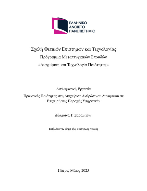 - Πρακτικές Διαχείρισης Ανθρώπινου Δυναμικού, Διοίκηση Ολικής Ποιότητας, Πρακτικές Υψηλής Απόδοσης Ανθρώπινου Δυναμικού, Οργανωσιακή Δέσμευση, Εργασιακή Ικανοποίηση, Πρακτικές Ποιότητας στην Εκπαίδευση