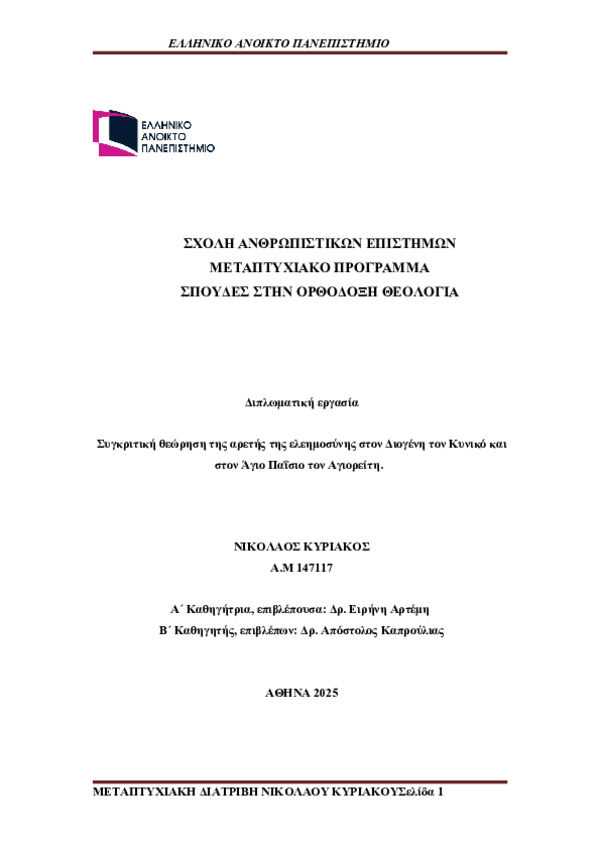 Η παρούσα μεταπτυχιακή εργασία επιχειρεί να συγκρίνει και να αναλύσει την αρετή της ελεημοσύνης μέσα από τη σκέψη, τις διδαχές και τον βίο δύο εμβληματικών μορφών: του Διογένη του Σινωπέα, εκπροσώπου της αρχαίας ελληνικής Κυνικής φιλοσοφίας, και του Αγίου Παϊσίου του Αγιορείτη, σύγχρονου ορθόδοξου ασκητή. Μέσα από τη μελέτη πρωτογενών πηγών και δευτερογενούς βιβλιογραφίας, αναδεικνύονται η πνευματική και η υλική διάσταση της ελεημοσύνης ως έμπρακτη εφαρμογή της αρετής και ως ουσιώδες στοιχείο του «κατά φύσιν βίου» στην κυνική φιλοσοφία, καθώς και του «εν Χριστώ βίου» στη χριστιανική οντολογία.