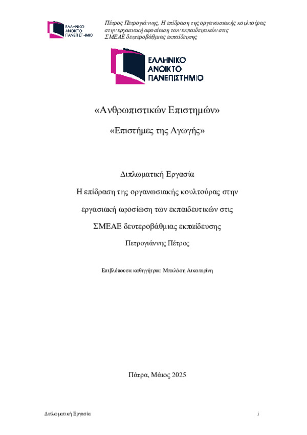 Η επίδραση της οργανωσιακής κουλτούρας στην εργασιακή αφοσίωση των εκπαιδευτικών στις ΣΜΕΑΕ δευτεροβάθμιας εκπαίδευσης