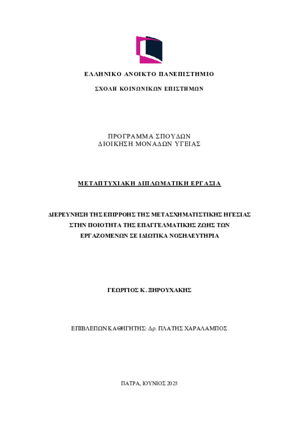 Διερεύνηση της επιρροής της μετασχηματιστικής ηγεσίας στην ποιότητα της επαγγελματικής ζωής των εργαζομένων σε ιδιωτικά νοσηλευτήρια