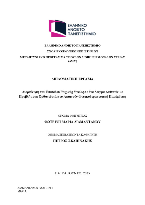 Διερεύνηση του Επιπέδου Ψυχικής Υγείας σε ένα Δείγμα Ασθενών με Προβλήματα Ορθοπεδικά που Απαιτούν Φυσικοθεραπευτική Παρέμβαση