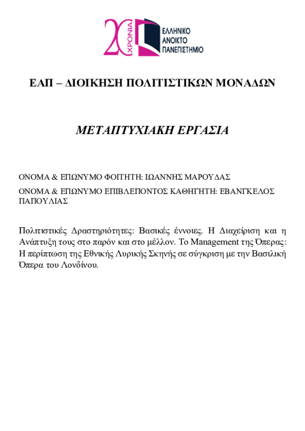 Cultural Activities: Basic Concepts. Their Management and Development in the Present and Future. Opera Management: The Case of the Greek National Opera in Comparison with the Royal Opera House in London. (Αγγλική)