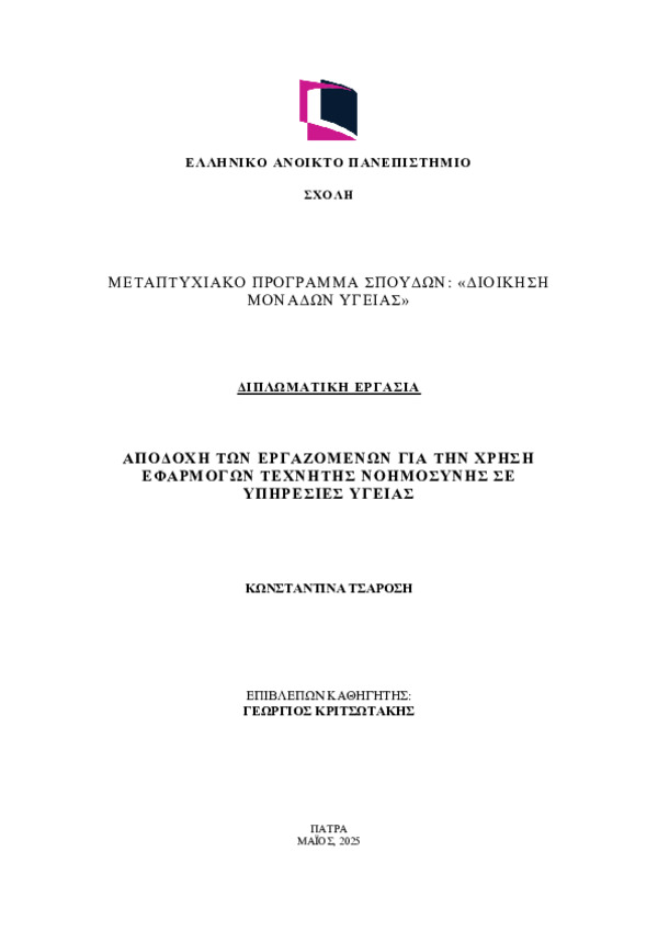 Η παρούσα μελέτη διερευνά την αποδοχή των εφαρμογών τεχνητής νοημοσύνης (ΤΝ) από επαγγελματίες υγείας στο Βενιζέλειο νοσοκομείο του Ηρακλείου Κρήτης. Ακολουθώντας ποσοτική ερευνητική προσέγγιση, συλλέχθηκαν πρωτογενή δεδομένα μέσω δομημένου ερωτηματολογίου που διανεμήθηκε σε 111 εργαζόμενους στον τομέα της υγείας, διαφόρων ειδικοτήτων και ιεραρχικών βαθμίδων. Το ερωτηματολόγιο αξιολόγησε τις στάσεις απέναντι στην αυτοματοποίηση υπηρεσιών υγείας με ΤΝ σε τρεις διαστάσεις: αντιλαμβανόμενη πιθανότητα, επιθυμία υλοποίησης και συναισθηματική αντίδραση, καλύπτοντας έξι λειτουργικούς τομείς: διοικητικές και οικονομικές διαδικασίες, εκπαίδευση και ανάπτυξη προσωπικού, κλινικές διαδικασίες, διαδικασίες ποιότητας και ασφάλειας, επικοινωνία και εξυπηρέτηση, καθώς και ερευνητικές δραστηριότητες.