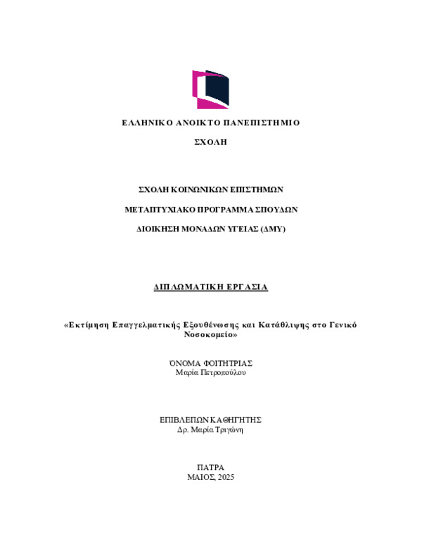 Η επαγγελματική εξουθένωση (burnout) και ψυχική καταπόνηση (κατάθλιψη, άγχος, στρεσ) αποτελούν φαινόμενα με αυξανόμενη παρουσία στο χώρο τησ υγείας. Η εργασλια σε νοσοκομειακές δομές συνεπάγεται υωηλές απαιτήσεις, που ενδέχεται να επιδράσουν αρνητικά στην ευημερία των επαγγελματιών υγείας.