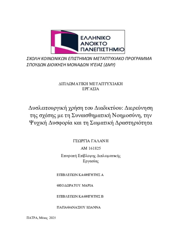 - Δυσλειτουργική χρήση του διαδικτύου: διερεύνηση της σχέσης με τη συναισθηματική νοημοσύνη, την ψυχική δυσφορία και τη σωματική δραστηριότητα/ Γεωργία Γαλάνη
