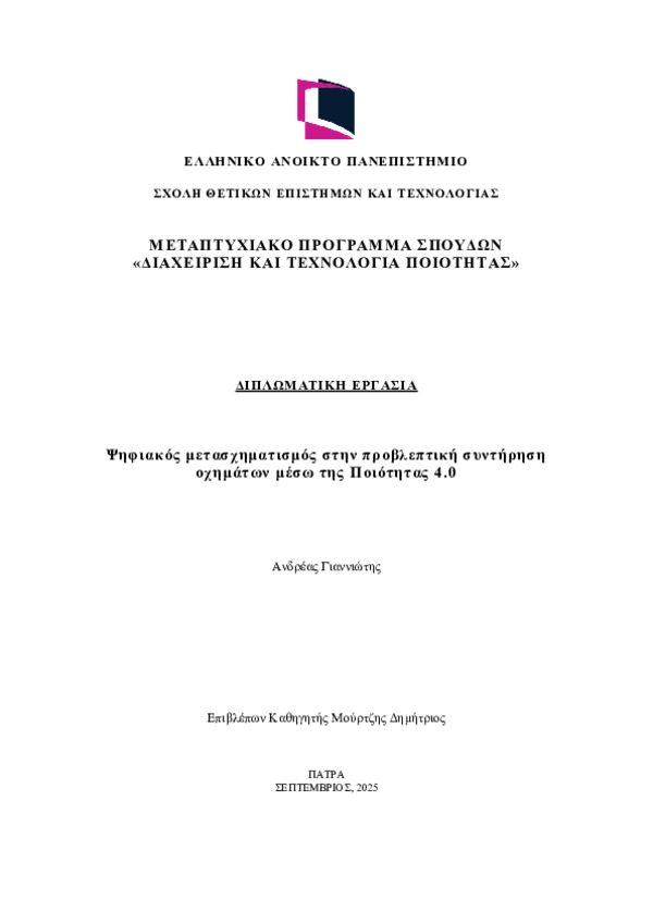 Η παρούσα μεταπτυχιακή εργασία διερευνά τον τρόπο με τον οποίο οι αρχές της Ποιότητας 4.0 μπορούν να επιταχύνουν τον ψηφιακό μετασχηματισμό της συντήρησης στον τομέα των οχημάτων, με έμφαση στην προβλεπτική συντήρηση (prescriptive maintenance – RxM). Αντί να περιοριστεί στη χαρτογράφηση υφιστάμενων τεχνικών, η εργασία επιχειρεί να αποτυπώσει τη βαθύτερη εννοιολογική και επιχειρησιακή δυναμική της RxM, ως συνέχεια και εξέλιξη της προγνωστικής συντήρησης (predictive maintenance – PdM), εστιάζοντας στις πραγματικές απαιτήσεις στόλων οχημάτων. Η βιβλιογραφική βάση συγκροτήθηκε βάσει συστηματικής ανασκόπησης 58 επιστημονικών και τεχνολογικών πηγών, αξιοποιώντας πρότυπα PRISMA, AMSTAR 2 και ROBIS, ώστε να διασφαλιστεί η εγκυρότητα και η αντικειμενικότητα της ανάλυσης. Μέσω της εννοιολογικής σύνθεσης και της μελέτης περιπτώσεων, αναδεικνύεται η καθοριστική σημασία της ενσωμάτωσης αισθητήρων, τεχνητής νοημοσύνης, ψηφιακών διδύμων και αρχιτεκτονικών cloud στην αποτελεσματική εφαρμογή RxM. Τα αποτελέσματα δείχνουν ότι η υιοθέτηση μοντέλων προβλεπτικής συντήρησης οδηγεί σε σημαντική μείωση κόστους, βελτίωση της διαθεσιμότητας, αύξηση της ασφάλειας και ενίσχυση της διαλειτουργικότητας των συστημάτων. Παράλληλα, προτείνεται ένα ενιαίο πολυεπίπεδο μοντέλο RxM που συνδέει τεχνολογικούς, οργανωσιακούς και στρατηγικούς άξονες με τις αρχές της επιχειρησιακής αριστείας και της βιώσιμης κινητικότητας. Η συμβολή της εργασίας εκτείνεται τόσο στη θεωρητική τεκμηρίωση όσο και στην παροχή εφαρμόσιμων εργαλείων και δεικτών προς χρήση από βιομηχανικούς φορείς, διαχειριστές στόλων και οργανισμούς ποιότητας.