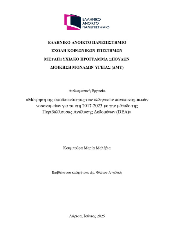 - Μέτρηση της αποδοτικότητας των ελληνικών πανεπιστημιακών νοσοκομείων για τα έτη 2017-2023 με την μέθοδο της Περιβάλλουσας Ανάλυσης Δεδομένων (DEA)