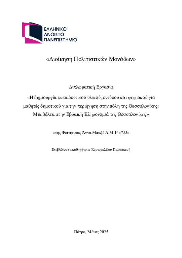 This Thesis focuses on the creation of a digital book dedicated to the preservation and promotion of the Jewish cultural heritage of Thessaloniki, with an emphasis on its pedagogical application for primary school students. Through a virtual tour following a geographical route "from east to west" across the city, students are introduced to key buildings, monuments, and sites of memory associated with the Jewish community, such as Villa Bianca, the Monastirioton Synagogue, the Jewish Museum of Thessaloniki, and the Modiano Market.