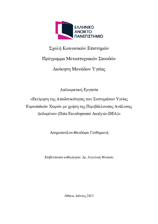 - Εκτίμηση της Αποδοτικότητας των Συστημάτων Υγείας Ευρωπαϊκών Χωρών με χρήση της Περιβάλλουσας Ανάλυσης Δεδομένων (Data Envelopment Analysis-DEA)