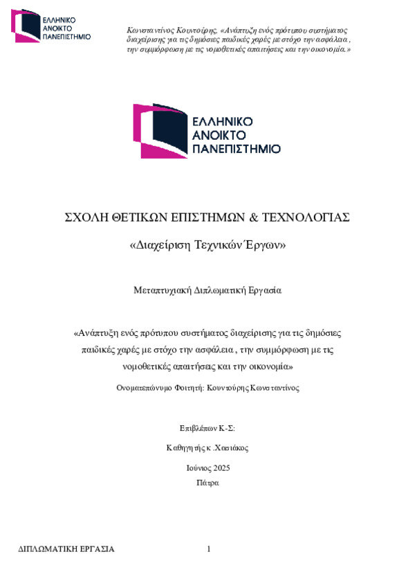 Ανάπτυξη ενός πρότυπου συστήματος διαχείρισης για τις δημόσιες παιδικές χαρές με στόχο την ασφάλεια , την συμμόρφωση με τις νομοθετικές απαιτήσεις και την οικονομία