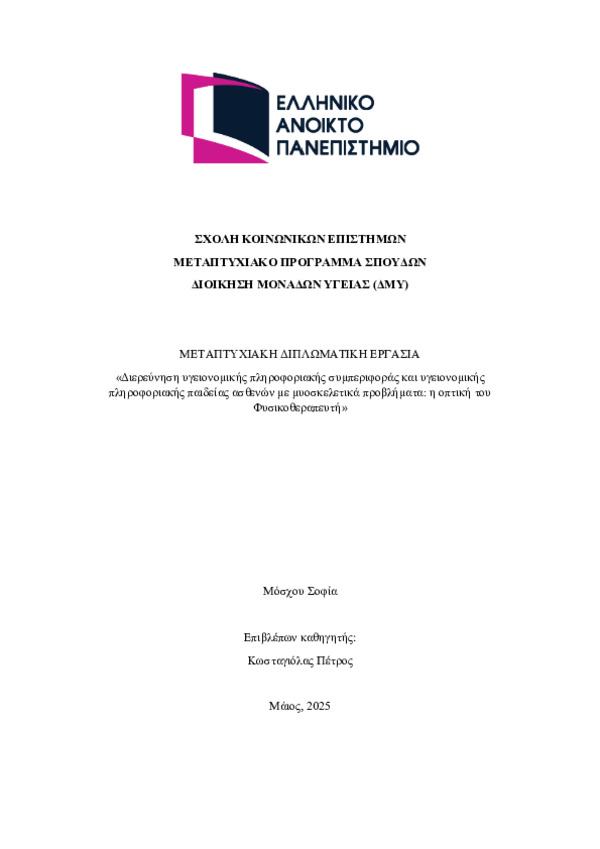 Οι μυοσκελετικές παθήσεις αποτελούν μία από τις συχνότερες αιτίες αναπηρίας παγκοσμίως, επηρεάζοντας την ποιότητα ζωής, την επαγγελματική δραστηριότητα και τη λειτουργικότητα των ασθενών. Η πρόσβαση σε αξιόπιστες πηγές υγειονομικής πληροφόρησης και η ενίσχυση της υγειονομικής παιδείας αναδεικνύονται ως καθοριστικοί παράγοντες για την πρόληψη και τη διαχείριση των μυοσκελετικών προβλημάτων. Στη σύγχρονη τεχνολογικά εξελισσόμενη εποχή, κρίνεται απαραίτητη η ενίσχυση της ψηφιακής υγειονομικής παιδείας που αφορά την ικανότητα των ατόμων να αναζητούν, να κατανοούν και να αξιολογούν τις πληροφορίες υγείας που λαμβάνουν από διαδικτυακές πηγές και ψηφιακά μέσα. Ο ρόλος του φυσικοθεραπευτή είναι πολυδιάστατος, λειτουργώντας ως κλινικός θεραπευτής αλλά και ως αξιόπιστος σύμβουλος στην παροχή και την αξιοποίηση των υγειονομικών πληροφοριών. Η παρούσα μελέτη διερευνά τις στάσεις και τις αντιλήψεις 121 ασθενών με μυοσκελετικές παθήσεις, σε σχέση με την υγειονομική πληροφόρηση, τη χρήση ψηφιακών μέσων και την επικοινωνία με τον φυσικοθεραπευτή. Τα αποτελέσματα δείχνουν ότι παρόλο που το διαδίκτυο χρησιμοποιείται συχνά ως μέσο άντλησης υγειονομικών πληροφοριών, η αξιοποίηση πιο σύγχρονων ψηφιακών μέσων, όπως της τεχνητής νοημοσύνης, παραμένει σε χαμηλά επίπεδα. Αντίθετα, αναδεικνύεται η αξία της προσωπικής σχέσης με τον φυσικοθεραπευτή, η οποία φαίνεται να προσφέρει μεγαλύτερη ασφάλεια και εμπιστοσύνη στους ασθενείς. Η ενίσχυση τόσο της υγειονομικής παιδείας όσο και της ψηφιακής υγειονομικής παιδείας κρίνεται απαραίτητη προκειμένου οι ασθενείς να είναι σε θέση να κατανοούν και να αξιολογούν την εγκυρότητα των διαθέσιμων πληροφοριών. Απώτερος σκοπός της διαδικασίας αυτής είναι η ενεργός συμμετοχή των ασθενών στη λήψη αποφάσεων για θέματα που αφορούν την υγεία τους, συμβάλλοντας έτσι στη βελτίωση των θεραπευτικών αποτελεσμάτων.