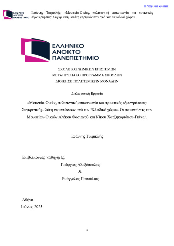 «Μουσεία-Οικίες, πολιτιστική επικοινωνία και πρακτικές εξωστρέφειας: Συγκριτική μελέτη περιπτώσεων από τον Ελλαδικό χώρο». Οι περιπτώσεις των Μουσείων-Οικιών Αλέκου Φασιανού και Νίκου Χατζηκυριάκου-Γκίκα".