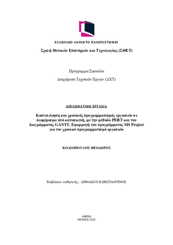 Στην παρούσα μελέτη εξετάζεται η κοστολόγηση και ο χρονικός προγραμματισμός μιας οικοδομικής δραστηριότητας και η κοστολόγηση των εργασιών υλοποίησης με τη χρήση της μεθόδου Pert, του διαγράμματος Gantt και του υπολογιστικού προγράμματος Ms Project. Η ανάλυση έγινε μέσα από το παράδειγμα μελέτης ‘Κατασκευή διαμερίσματος στην περιοχή της Βούλας’.