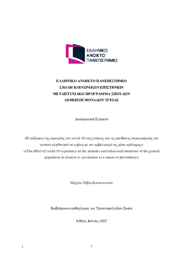 This thesis investigates the impact of the COVID-19 pandemic experience on the formation of attitudes and intentions towards vaccination in the general population of Greece. The study sample consisted of 121 individuals, with the majority aged 30-39 years (46%), 53% males, 39% females, and 8% did not disclose their gender. Thirty-nine percent hold a university or technical institute degree, 31% have completed high school, and 13% possess a postgraduate degree.