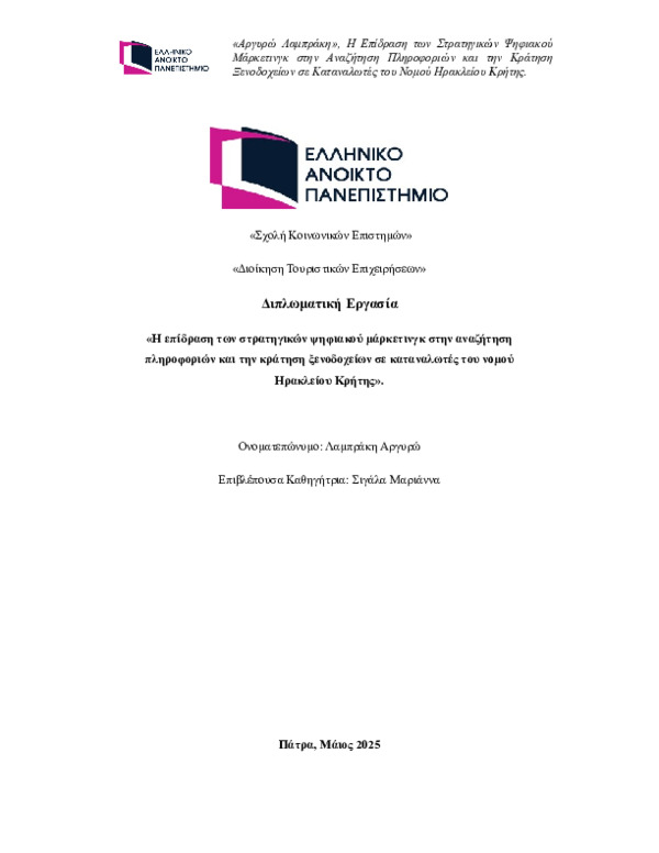 Περιγραφή: Η επίδραση των στρατηγικών ψηφιακού μάρκετινγκ στην αναζήτηση πληροφοριών και την κράτηση ξενοδοχείων σε καταναλωτές του νομού Ηρακλείου Κρήτης.pdf (pdf) Book Reader