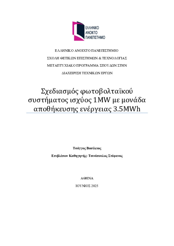 Η παρούσα διπλωματική εργασία αφορά τον ολοκληρωμένο σχεδιασμό ενός φωτοβολταϊκού σταθμού ισχύος 1 MWp με ενσωματωμένη μονάδα αποθήκευσης ενέργειας 3,5 MWh, προσαρμοσμένο στις απαιτήσεις της Ελληνικής αγοράς και των κανονισμών σύνδεσης δικτύου. Στόχος είναι η τεχνική και οικονομική ανάλυση όλων των υποσυστημάτων, από τα φωτοβολταϊκά πλαίσια και τους inverters μέχρι το σύστημα αποθήκευσης (BESS), τον υποσταθμό μέσης τάσης και το σύστημα SCADA.
