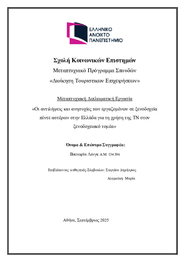 Η παρούσα μελέτη στοχεύει να διερευνήσει τις αντιλήψεις των εργαζομένων σχετικά με τη χρήση της τεχνητής νοημοσύνης στα ξενοδοχεία πέντε αστέρων.