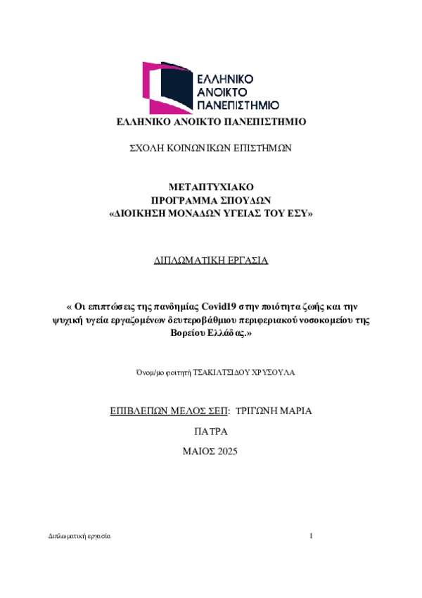 - Πανδημία Covid-19, ποιότητα ζωής, Ψυχική Υγεία, επαγγελματίες Υγείας