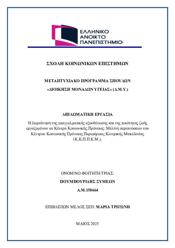 The investigation of the burnout and quality of life of workers in Social Welfare Centers. Case study of the Social Welfare Center of Central Macedonia Region (K.K.P.P.K.M.). (Αγγλική)
