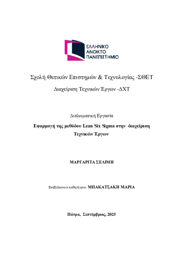 Η διαχείριση ενός Τεχνικού έργου αντιμετωπίζει ιδιαίτερες προκλήσεις σε ένα ιδιαίτερα ανταγωνιστικό και δυναμικά μεταβαλλόμενο περιβάλλον. Η αυξανόμενη ανάγκη εποπτείας ενός Τεχνικού έργου αποτελεί ένα σύνθετο αντικείμενο το οποίο προσβλέπει κυρίως στον έλεγχο της διατήρησης του χρονικού και οικονομικού προγραμματισμού του , διασφαλίζοντας την απαιτούμενη ποιότητα κατασκευής, εξασφαλίζοντας ένα ασφαλές εργοταξιακό περιβάλλον, ενώ ιδιαίτερη εποπτεία απαιτείται στην διαχείριση των περιβαλλοντικών επιπτώσεων της εκάστοτε κατασκευής προς το περιβάλλον και στο κοινωνικό σύνολο συμβάλλοντας στην αειφόρο ανάπτυξη. Στην παρούσα εργασία εξετάζετε αν η συστηματική εφαρμογή της ποιοτικής μεθόδου Lean Six Sigma έναντι άλλων ποιοτικών μεθόδων, αποτελεί ένα ισχυρό εργαλείο για την βελτιοποίηση της διαχείρισης ενός Τεχνικού Έργου στο Ελληνικό κατασκευαστικό τομέα καθώς δεν υπάρχουν πληροφορίες σχετικά με την χρήση της στην Ελληνική αγορά, σε αντίθεση με την εφαρμογή της στον κατασκευαστικό τομέα σε διεθνές επίπεδο. Η Lean Six Sigma δεν είναι μια θεωρητική ποιοτική μέθοδος, αλλά βασίζεται σε στατιστικά δεδομένα και χρησιμοποιεί συγκεκριμένα εργαλεία προσδοκώντας στην εξάλειψη αστοχιών και την βελτιοποίηση των διαδικασιών προκειμένου να επιτευχθεί το μέγιστο τελικό αποτέλεσμα, γεγονός που διασφαλίζει στα Διευθυντικά στελέχη διαχείρισης ενός έργου, ότι εκτός της πολύτιμης εμπειρίας τους, έχουν και μια πρακτική μέθοδο για την λήψη των αποφάσεων τους . Στην συγκεκριμένη εργασία πέραν της αναλυτικής περιγραφής της μεθόδου Lean Six Sigma και των εργαλείων που χρησιμοποιεί, πραγματοποιείται εφαρμογής της σε συγκεκριμένο τεχνικό έργο προκειμένου να αποδειχθεί η συμβολή της στην βελτιοποίηση της διαχείρισης του. Για τον λόγο αυτό παρουσιάζονται τα αποτελέσματα της εφαρμογής, τα αντίστοιχα συμπεράσματα καθώς και οι δυσκολίες στην εφαρμογή ,όπως επίσης και θέματα που χρίζουν περαιτέρω έρευνα. Γενικά σκοπός της παρούσας εργασίας είναι να αναδείξει την αναγκαιότητα χρήσης της μεθόδου Lean Six Sigma στην διαχείριση των Τεχνικών Έργων για την διασφάλιση των διαδικασιών και του τελικού προϊόντος, εξασφαλίζοντας την ικανοποίηση των εμπλεκόμενων μελών καθώς και του τελικού αποδέκτη.