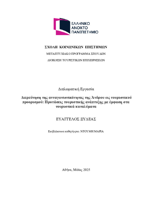 Η παρούσα εργασία μελετά την ανταγωνιστικότητα της Άνδρου ως τουριστικού προορισμού, δίνοντας έμφαση στον ρόλο που διαδραματίζουν τα τουριστικά καταλύματα στη συνολική εικόνα και την ανάπτυξή της. Στο πλαίσιο της γενικότερης προσπάθειας για βιώσιμη τουριστική ανάπτυξη στα ελληνικά νησιά, αναδεικνύεται η σημασία της διαφοροποίησης, της ποιότητας των παρεχόμενων υπηρεσιών και της ικανοποίησης των επισκεπτών ως βασικά στοιχεία ενίσχυσης της ελκυστικότητας ενός προορισμού.