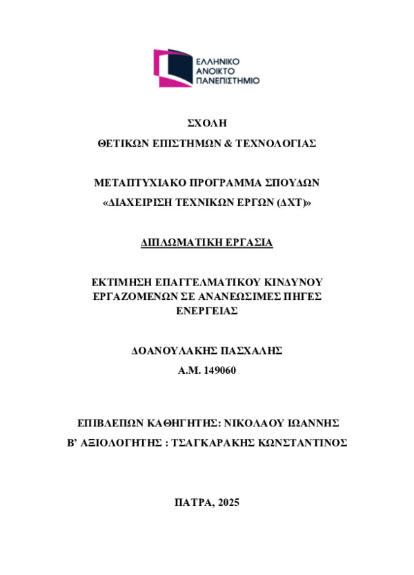 Η παρούσα εργασία πραγματεύεται την εκτίμηση του επαγγελματικού κινδύνου εργαζομένων που απασχολούνται στον τομέα των ανανεώσιμων πηγών ενέργειας (ΑΠΕ). Αφετηρία αποτέλεσε η θεωρητική επισκόπηση της επαγγελματικής ασφάλειας και υγείας, δίνοντας έμφαση σε θεωρίες και μοντέλα όπως η ασφάλεια με βάση τη συμπεριφορά και η κουλτούρα ασφάλειας, ενώ παρουσιάστηκαν διεθνή πρότυπα, όπως το ISO 45001, και νομοθετικές διατάξεις. Η εμπειρική έρευνα υιοθέτησε ποσοτική μεθοδολογική προσέγγιση, με εργαλείο συλλογής δεδομένων ένα δομημένο ερωτηματολόγιο που κάλυπτε δημογραφικά στοιχεία, στάσεις απέναντι στην ασφάλεια, εμπειρίες με ατυχήματα (ή near miss), εκτιμήσεις για την πιθανότητα και τη σοβαρότητα ατυχημάτων και αντίληψη για παράγοντες πρόκλησης ατυχημάτων. Το δείγμα της έρευνας περιλάμβανε 111 εργαζομένους διαφόρων ηλικιακών ομάδων και επιπέδων εκπαίδευσης. Η ανάλυση των δεδομένων έδειξε ότι, παρόλο που οι περισσότεροι εργαζόμενοι γνωρίζουν τους κινδύνους και διαθέτουν εκπαίδευση για την πρόληψη και την αντιμετώπιση τους, αρκετοί είχαν βιώσει ή είχαν δει περιστατικά near miss ή εργατικά ατυχήματα. Το υψηλό ποσοστό γνώσης της σοβαρότητας των συνεπειών δείχνει καλή ενημέρωση, αλλά ταυτόχρονα αναδεικνύονται ελλείψεις σε θέματα όπως η ομαδικότητα, η τήρηση κανόνων και η διαχείριση της πίεσης. Στη βάση αυτών των ευρημάτων, προτείνονται δράσεις όπως η συνεχής κατάρτιση, η ενίσχυση των συστημάτων αναφοράς κινδύνων και η υιοθέτηση συμμετοχικών πρακτικών για τη βελτίωση της ασφάλειας. Συνολικά, η εργασία υπογραμμίζει τη σημασία της ολιστικής διαχείρισης της ασφάλειας στην ταχέως αναπτυσσόμενη βιομηχανία των ΑΠΕ.
