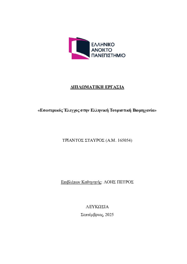 Αυτή η μελέτη θα εμβαθύνει στη σχέση μεταξύ της τουριστικής βιομηχανίας και του εσωτερικού ελέγχου με απώτερο στόχο την αξιολόγηση της σημασίας του τελευταίου στη διαχείριση κινδύνων μαζί με θέματα διαφάνειας και βελτίωσης της ανταγωνιστικότητας των τουριστικών επιχειρήσεων. Η εργασία θα επικεντρωθεί περισσότερο στην έννοια και τα στοιχεία του εσωτερικού ελέγχου, αντλώντας τη διάκρισή του από τον εξωτερικό έλεγχο, και την πτυχή της ηθικής και των ηθικών διλημμάτων που εμφανίζονται κατά την εφαρμογή του.