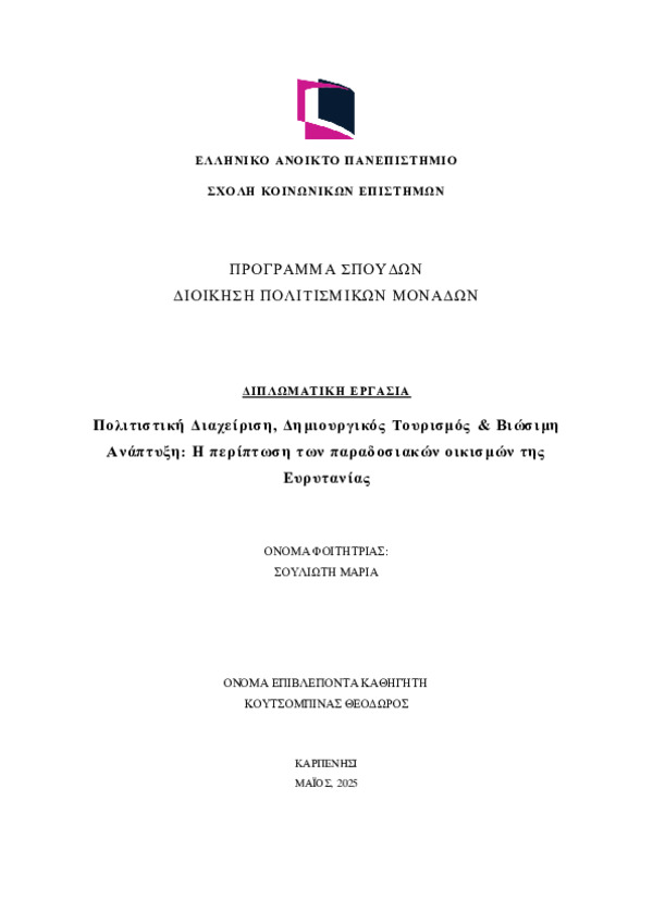Πολιτιστική Διαχείριση, Δημιουργικός Τουρισμός & Βιώσιμη Ανάπτυξη: Η περίπτωση των παραδοσιακών οικισμών της Ευρυτανίας Περιγραφή: ΔΙΠΛΩΜΑΤΙΚΗ_ΣΟΥΛΙΩΤΗ Μ.pdf (pdf)