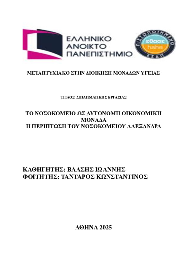 - Νοσοκομεία, οικονομική διαχείριση, χρηματοδότηση, βιωσιμότητα, δημόσιο σύστημα υγείας, λειτουργικό κόστος, Νοσοκομείο "Αλεξάνδρα", τεχνολογική καινοτομία.