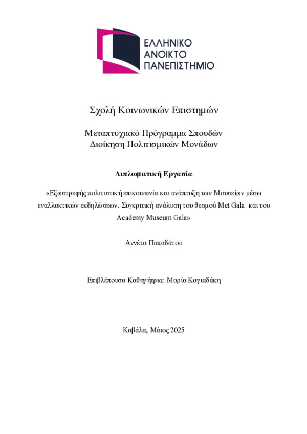 Περιγραφή: Παπαδάτου Αννέτα -Eξωστρεφής πολιτιστική επικοινωνία και ανάπτυξη των Μουσείων μέσω εναλλακτικών εκδηλώσεων. Συγκριτική ανάλυση του θεσμού Met Gala και του Academy Museum Gala Διπλωματική ΔΠΜ .pdf (pdf) Book Reader