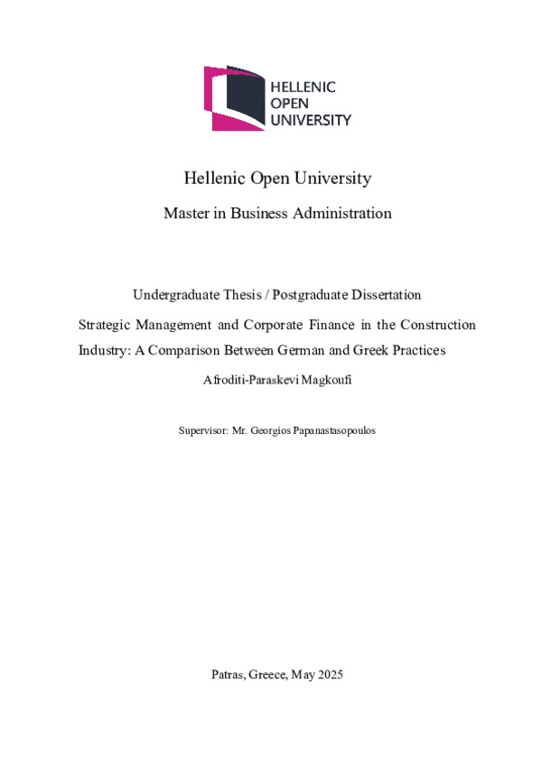 Στην ανασκόπηση παρουσιάζονται και συζητούνται τα βασικά θεωρητικά πλαίσια της Εταιρικής Χρηματοοικονομικής και της Στρατηγικής Διοίκησης, λαμβάνοντας υπόψη μια ανασκόπηση των Χρηματοδοτικών Δομών και των Πρακτικών Επένδυσης Κεφαλαίου, καθώς και της Διαχείρισης Κινδύνων και των Σκεπτικών Βιωσιμότητας στον κλάδο. Η ανάλυση της εργασίας βασίζεται σε μια συγκριτική μεθοδολογία μελέτης περιπτώσεων με τη δέουσα υποστήριξη από δευτερογενή δεδομένα. Η ανασκόπηση παρουσιάζει και συζητά τα βασικά θεωρητικά πλαίσια της Εταιρικής Χρηματοδότησης και της Στρατηγικής Διοίκησης, εξετάζοντας μια ανασκόπηση των χρηματοοικονομικών δομών και των πρακτικών επένδυσης κεφαλαίου, καθώς και τη διαχείριση κινδύνων και τις εκτιμήσεις για τη βιωσιμότητα στον κλάδο. Η ανάλυση βασίζεται σε μια συγκριτική μεθοδολογία μελέτης περιπτώσεων με τη δέουσα υποστήριξη από δευτερογενή δεδομένα, στοιχεία που περιλαμβάνουν επίσημες ευρωπαϊκές και εθνικές πηγές, εκθέσεις εταιρειών και ακαδημαϊκή βιβλιογραφία σχετικά με την εταιρική χρηματοδότηση και την πρακτική της στρατηγικής διαχείρισης στις δύο αυτές χώρες - προμήθεια κεφαλαίων, ανταπόκριση στην κρίση, ψηφιακός μετασχηματισμός, δυναμική της εργασίας και υιοθέτηση ESG. Επίσης, συνθέτει τα αποτελέσματα αυτής της μελέτης και προβληματίζεται για τον τρόπο με τον οποίο η οικονομική κουλτούρα, τα ρυθμιστικά καθεστώτα και οι θεσμικές δομές επηρεάζουν τις διοικητικές επιλογές στον κατασκευαστικό τομέα. Για να προσθέσει εμπειρική ισχύ στα συμπεράσματά της, ως εκ τούτου, η διατριβή θα κατασκευάσει δομημένους στατιστικούς πίνακες των επενδυτικών τάσεων, των τιμών διακυμάνσεων των δομικών υλικών, των εισροών ΑΞΕ, των ποσοστών αναφοράς ESG και των τη δυναμική της επαγγελματικής κατάρτισης. Μπορεί να συναχθεί ότι, σε αντίθεση με την Ελλάδα όπου η αγορά παρουσιάζει σημάδια προσαρμοστικής ανάκαμψης με αυξανόμενες ιδιωτικές επενδύσεις αλλά διαρθρωτικούς περιορισμούς, ο γερμανικός κατασκευαστικός τομέας είναι περισσότερο δομημένος και προσανατολισμένος στις εξαγωγές και ψηφιοποιημένος. Μια πειστική μελέτη με πολιτικές συστάσεις και στρατηγικές ιδέες για τους ενδιαφερόμενους φορείς δίνει έμφαση στις βιώσιμες επενδύσεις μαζί με την ψηφιακή ετοιμότητα και την οικονομική ανθεκτικότητα και στα δύο πλαίσια.
