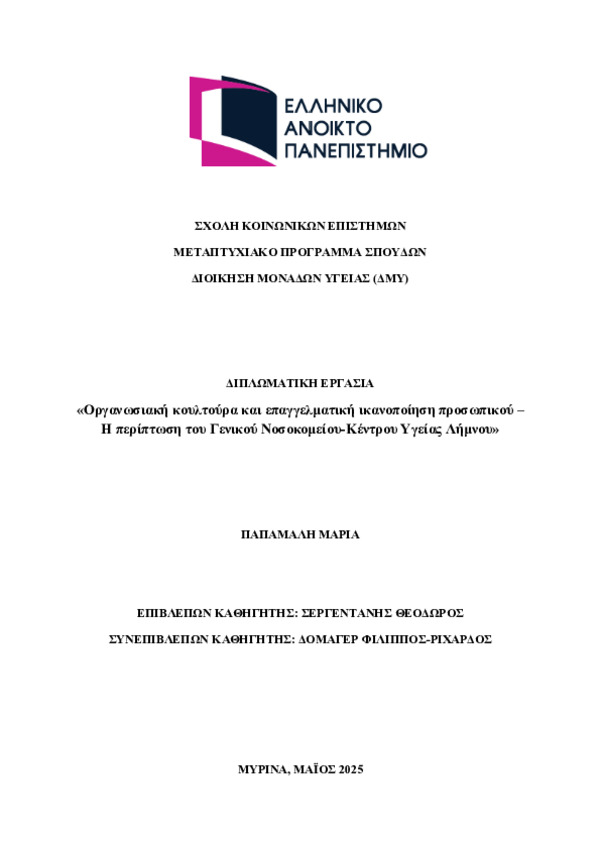 Organizational culture and employee job satisfaction – The case of the General Hospital-Health Center of Limnos (Αγγλική)