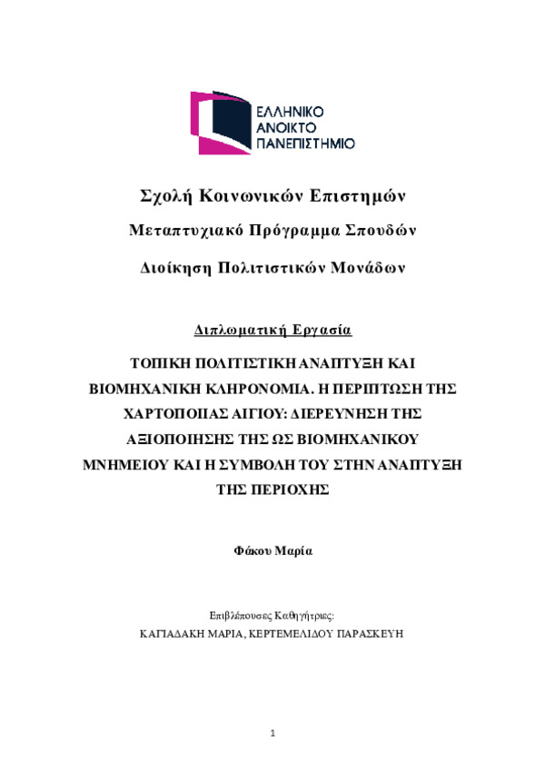 ΤΟΠΙΚΗ ΠΟΛΙΤΙΣΤΙΚΗ ΑΝΑΠΤΥΞΗ ΚΑΙ ΒΙΟΜΗΧΑΝΙΚΗ ΚΛΗΡΟΝΟΜΙΑ. Η ΠΕΡΙΠΤΩΣΗ ΤΗΣ ΧΑΡΤΟΠΟΙΙΑΣ ΑΙΓΙΟΥ: ΔΙΕΡΕΥΝΗΣΗ ΤΗΣ ΑΞΙΟΠΟΙΗΣΗΣ ΤΗΣ ΩΣ ΒΙΟΜΗΧΑΝΙΚΟΥ ΜΟΥΣΕΙΟΥ ΚΑΙ Η ΣΥΜΒΟΛΗ ΤΟΥ ΣΤΗΝ ΑΝΑΠΤΥΞΗ ΤΗΣ ΠΕΡΙΟΧΗΣ.
