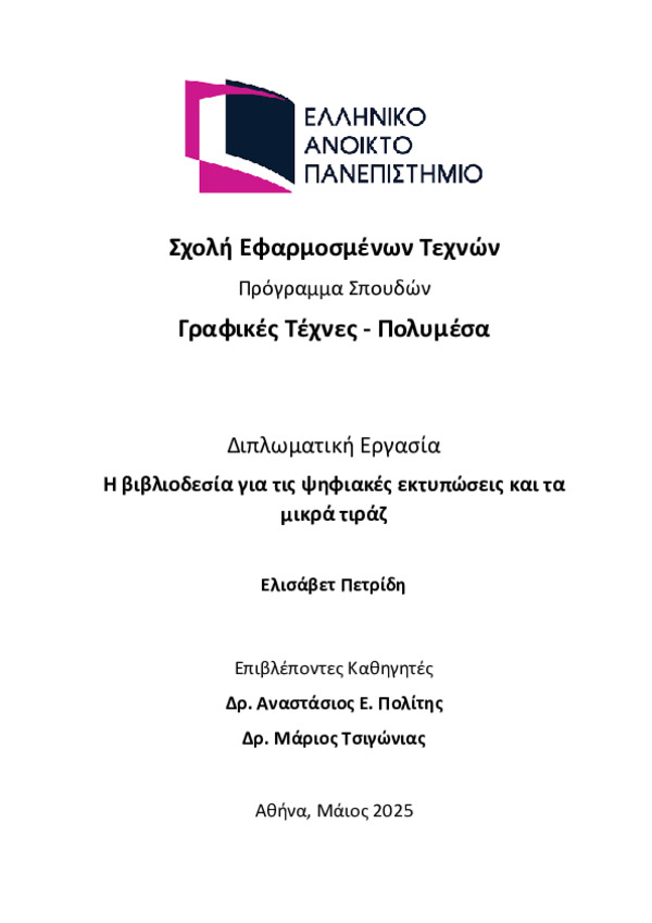 - Διπλωματική Εργασία: Η βιβλιοδεσία για τις ψηφιακές εκτυπώσεις και τα μικρά τιράζ