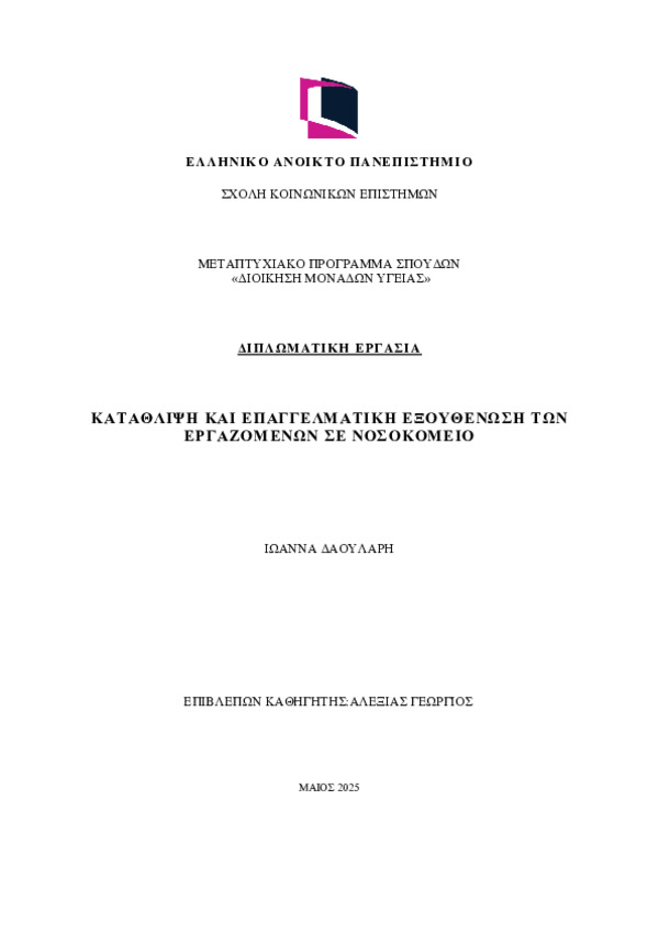 Η παρούσα μελέτη εστιάζει στη διερεύνηση δύο σοβαρών φαινομένων που επηρεάζουν την ψυχική υγεία του νοσηλευτικού προσωπικού στα νοσοκομεία: της κατάθλιψης και της επαγγελματικής εξουθένωσης (burnout). Στόχος της έρευνας είναι η αποτύπωση των επιπέδων τους, η διερεύνηση της μεταξύ τους συσχέτισης, καθώς και ο εντοπισμός κοινωνικοδημογραφικών και επαγγελματικών παραγόντων που σχετίζονται με την εμφάνισή τους. Η έρευνα ακολούθησε ποσοτική προσέγγιση και πραγματοποιήθηκε σε δείγμα 100 νοσηλευτών που εργάζονται σε νοσοκομεία της Αττικής. Για τη συλλογή των δεδομένων χρησιμοποιήθηκαν δύο ψυχομετρικά εργαλεία: η Κλίμακα Κατάθλιψης του Beck (BDI) και το Ερωτηματολόγιο Επαγγελματικής Εξουθένωσης της Maslach (MBI). Η στατιστική ανάλυση περιλάμβανε περιγραφική στατιστική, έλεγχο διαφορών, συσχετίσεις και παλινδρόμηση. Τα αποτελέσματα έδειξαν ότι το 99% των συμμετεχόντων παρουσίασε σοβαρή κατάθλιψη και το 100% υψηλό επίπεδο αποπροσωποποίησης. Η μέση βαθμολογία στην κατάθλιψη ήταν 45,99, ενώ το συνολικό σκορ burnout έφτασε τις 75,48 μονάδες. Διαπιστώθηκε ισχυρή θετική συσχέτιση μεταξύ κατάθλιψης και burnout. Επίσης, οι γυναίκες και οι νεότεροι νοσηλευτές εμφάνισαν υψηλότερα επίπεδα καταθλιπτικών συμπτωμάτων. Επαγγελματικοί παράγοντες όπως τα έτη προϋπηρεσίας, το είδος απασχόλησης και το τμήμα εργασίας σχετίστηκαν με την κατάθλιψη, αλλά όχι με το συνολικό επίπεδο burnout.