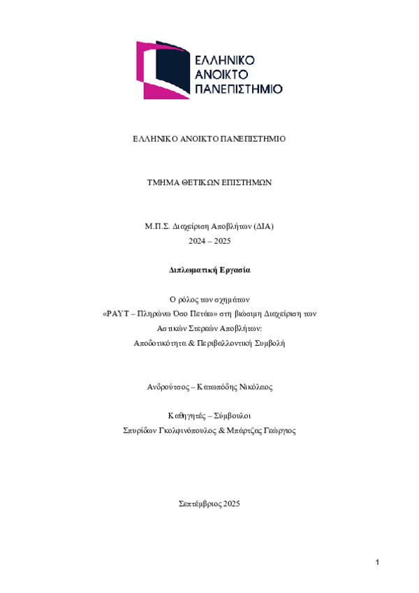 - Πληρώνω Όσο Πετάω (PAYT); Αστικά Στερεά Απόβλητα; Διαχείριση Αποβλήτων; Κυκλική Οικονομία; Βιωσιμότητα; Περιβαλλοντική Πολιτική; Ανακύκλωση; Μείωση Αποβλήτων; Οικονομικά Εργαλεία; Ελλάδα