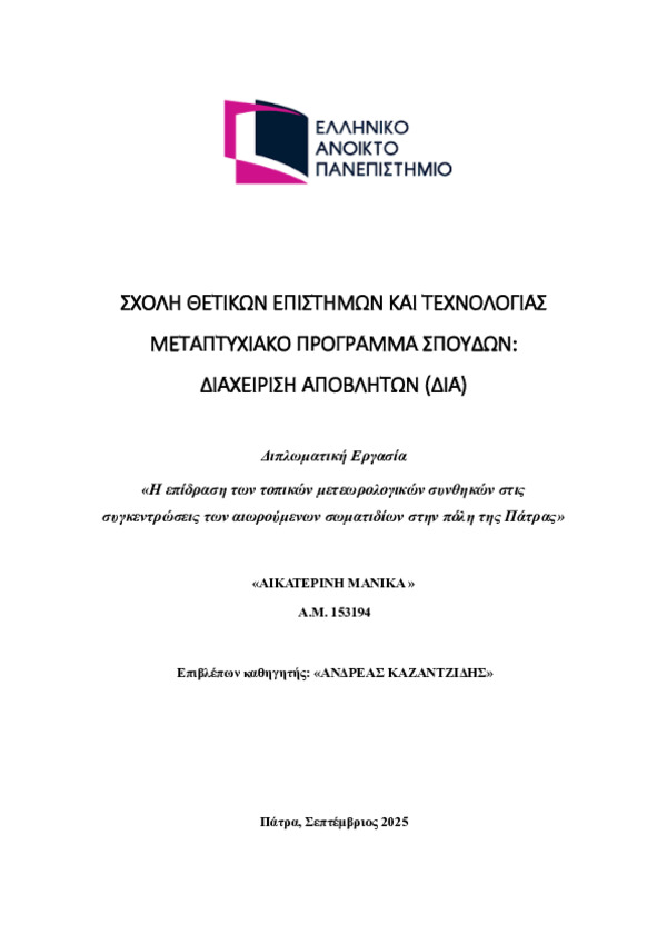 Η ατμοσφαιρική ρύπανση αποτελεί ένα από τα πλέον κρίσιμα περιβαλλοντικά ζητήματα των σύγχρονων αστικών περιοχών, με σοβαρές επιπτώσεις στη δημόσια υγεία και την ποιότητα ζωής. Ανάμεσα στους βασικούς ατμοσφαιρικούς ρύπους, τα αιωρούμενα σωματίδια (PM1, PM2.5, PM10) διαδραματίζουν πρωτεύοντα ρόλο, καθώς η παρουσία τους στην ατμόσφαιρα συνδέεται με αυξημένα περιστατικά αναπνευστικών και καρδιοαγγειακών νοσημάτων. Η κατανομή και συγκέντρωση των PM επηρεάζεται σημαντικά από μετεωρολογικές παραμέτρους όπως η θερμοκρασία, η υγρασία, ο άνεμος και η ατμοσφαιρική πίεση, οι οποίες αλληλεπιδρούν με πολύπλοκους τρόπους με τις πηγές εκπομπών και τους μηχανισμούς διασποράς.