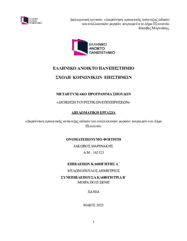 After an extensive discussion on the role of public bodies — a decisive factor in the development of tourism in any country — as well as an analysis of special and alternative tourism forms, the research will focus on the Municipality of Platanias. This will include a presentation of the current tourism landscape of the municipality and an examination of the Municipality's role as a local government authority.