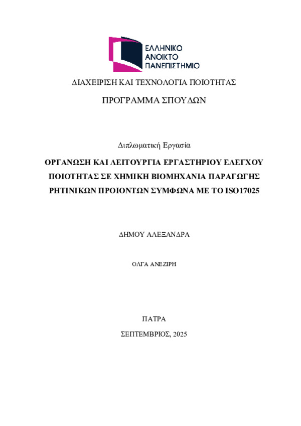 Οργάνωση και λειτουργία εργαστηρίου ελέγχου ποιότητας σε χημική βιομηχανία παραγωγής ρητινικών προϊόντων σύμφωνα με το ISO17025