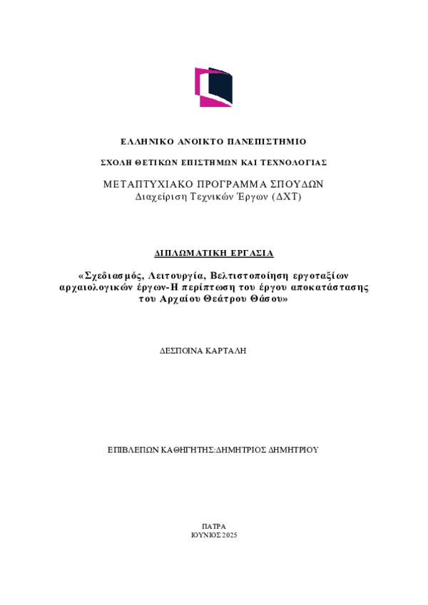 The methodology combines an extensive review of Greek and international literature, an analysis of the legal framework (with emphasis on the Ministry of Culture’s procedures and the role of the Central Archaeological Council), and primary quantitative and qualitative research through a questionnaire addressed to professionals involved in archaeological site operations. Additionally, a case study is presented based on the restoration project of the Ancient Theatre of Thassos, where a technical analysis of the work schedule is conducted using MS Project software.