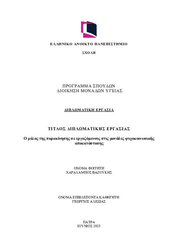 Η παρούσα μελέτη, με τίτλο εξετάζει τη σχέση μεταξύ παρακίνησης και εργασιακής ικανοποίησης των επαγγελματιών ψυχικής υγείας. Σκοπός της έρευνας είναι η διερεύνηση του βαθμού παρακίνησης των εργαζομένων στις μονάδες ψυχοκοινωνικής αποκατάστασης και της επίδρασής της στην εργασιακή τους ικανοποίηση και, κατ’ επέκταση, στην ποιότητα των παρεχόμενων υπηρεσιών. Υλικό και μέθοδος: Πραγματοποιήθηκε ποσοτική συγχρονική έρευνα με δείγμα 162 εργαζομένων από μονάδες ψυχοκοινωνικής αποκατάστασης στην Ελλάδα. Χρησιμοποιήθηκε ερωτηματολόγιο αυτοαναφοράς, το οποίο περιλάμβανε δημογραφικά στοιχεία και ερωτήσεις βασισμένες στις θεωρίες παρακίνησης των Maslow και Herzberg, καθώς και στις διαστάσεις της εργασιακής ικανοποίησης (μισθός, προαγωγή, προϊστάμενος, συνθήκες εργασίας, συνάδελφοι κ.ά.). Αποτελέσματα: Τα ευρήματα έδειξαν μέτρια έως υψηλά επίπεδα παρακίνησης, τα οποία συνδέονται θετικά με την εργασιακή ικανοποίηση. Οι κυριότεροι παράγοντες παρακίνησης είναι η συναδελφικότητα, η φύση της εργασίας και το αίσθημα κοινωνικής προσφοράς, ενώ χαμηλότερη ικανοποίηση εντοπίζεται σε θέματα μισθολογικά και επαγγελματικής ανέλιξης. Επιπλέον, διαπιστώθηκε ότι η εσωτερική παρακίνηση (αναγνώριση, αυτονομία, νόημα στο έργο) ενισχύει σημαντικά τη δέσμευση και μειώνει τα επίπεδα επαγγελματικής εξουθένωσης. Συμπεράσματα: Η παρακίνηση αποτελεί καθοριστικό παράγοντα για την αποδοτικότητα και τη διατήρηση της ψυχικής ανθεκτικότητας των επαγγελματιών ψυχικής υγείας. Η ενίσχυση των εσωτερικών κινήτρων, η αναγνώριση του έργου και η ύπαρξη υποστηρικτικού εργασιακού περιβάλλοντος δύνανται να αυξήσουν την ικανοποίηση, να βελτιώσουν την ποιότητα των υπηρεσιών και να ενισχύσουν τη βιωσιμότητα των δομών ψυχικής υγείας.