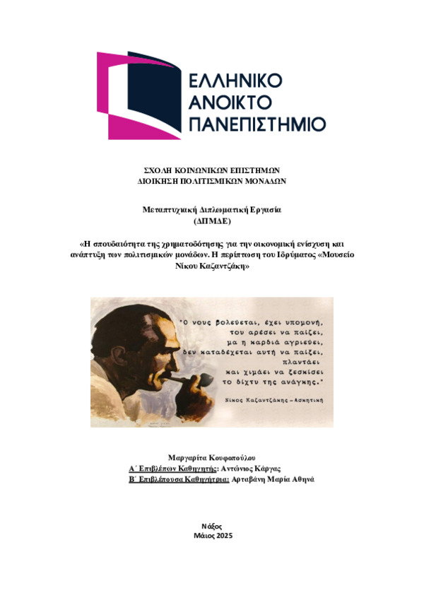 The theoretical framework outlines key concepts regarding cultural units, their administration, financial management, and resource allocation. The study proceeds with an analysis of contemporary approaches to museums and their contribution to society and local development. The case study of the Nikos Kazantzakis Museum provides an in-depth examination of its financial reports and budgets, the forms and sources of funding, state subsidies, donations, and the impact of institutional collaborations.