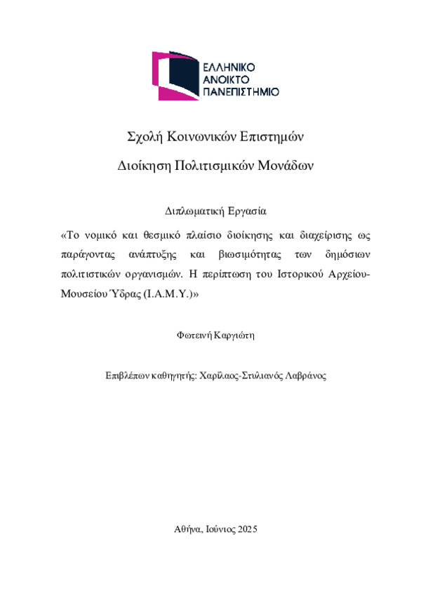 Η εργασία πραγματεύεται το ζήτημα της διαμόρφωσης του νομικού και θεσμικού πλαισίου που διέπει την οργάνωση, διοίκηση και διαχείριση των δημόσιων πολιτιστικών οργανισμών και την επίδρασή του στο σχεδιασμό και την υλοποίηση του οράματος και της στρατηγικής τους. Στο θεωρητικό μέρος αναλύεται η ανάπτυξη των λειτουργιών διοίκησης και εξετάζονται οι πηγές χρηματοδότησης των μη κερδοσκοπικών οργανισμών στους οποίους εντάσσονται οι δημόσιοι πολιτιστικοί οργανισμοί. Γίνεται αναφορά στο πλαίσιο λειτουργίας και χρηματοδότησης των δημόσιων πολιτιστικών οργανισμών στην Ελλάδα και στις προκλήσεις που αντιμετωπίζει το ελληνικό κράτος στην άσκηση της πολιτιστικής του πολιτικής σε συνθήκες κρίσεις και ψηφιακού μετασχηματισμού. Η μελέτη περίπτωσης παρουσιάζει το μοντέλο διοίκησης και οικονομικής διαχείρισης του Ιστορικού Αρχείου-Μουσείου Ύδρας (Ι.Α.Μ.Υ.). Το Ι.Α.Μ.Υ. είναι δημόσιος φορέας και αποτελεί Περιφερειακή Υπηρεσία των Γενικών Αρχείων του Κράτους (Γ.Α.Κ.). Διέπεται από ένα ειδικό νομικό πλαίσιο διαχείρισης που του επιτρέπει την οργανωτική και οικονομική ευελιξία, σε αντίθεση με τις υπόλοιπες Περιφερειακές Υπηρεσίες των Γ.Α.Κ., και το καθιστά ικανό να διοργανώνει ποικίλες πολιτιστικές δράσεις που προσελκύουν χιλιάδες επισκέπτες. Σκοπός της εργασίας είναι να αναδείξει τους τρόπους με τους οποίους το νομικό και θεσμικό πλαίσιο οργάνωσης, διοίκησης και χρηματοδότησης των δημόσιων πολιτιστικών οργανισμών μπορεί να επηρεάσει τον σχεδιασμό και την εφαρμογή του οράματος και της στρατηγικής τους. Εξετάζεται η πολιτιστική στρατηγική της ελληνικής Πολιτείας σε ζητήματα οργανωτικής διαχείρισης και χρηματοδότησης των πολιτιστικών οργανισμών που εποπτεύονται από το κράτος. Η παρούσα μελέτη δίνει έμφαση στην αξία εφαρμογής των αρχών μάνατζμεντ στους κρατικούς πολιτιστικούς οργανισμούς και προτείνει αφενός ένα θεσμικό πλαίσιο διασφάλισης του δημοσίου συμφέροντας και αφετέρου σύγχρονα χρηματοδοτικά εργαλεία που εξασφαλίζουν την οικονομική ευελιξία και βιωσιμότητα στο σύγχρονο μεταβαλλόμενο περιβάλλον.