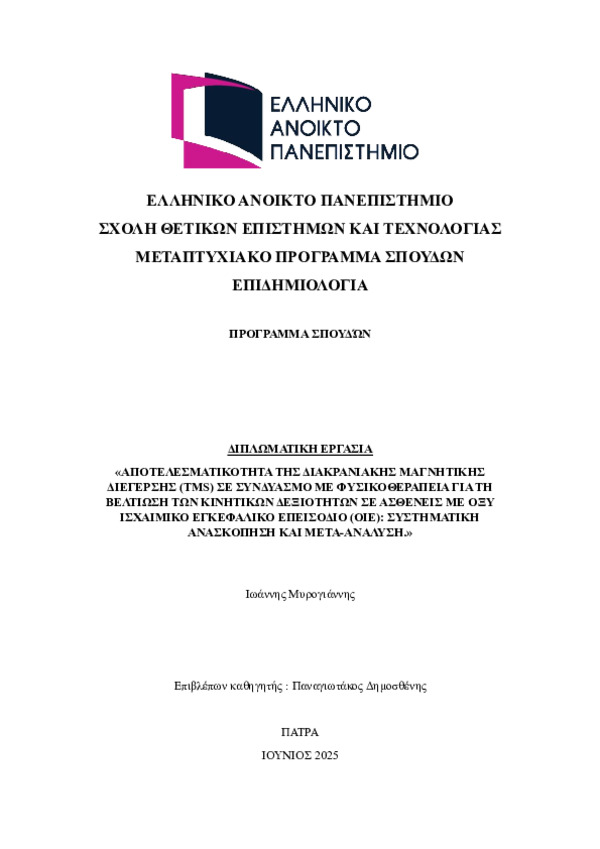 ΑΠΟΤΕΛΕΣΜΑΤΙΚΟΤΗΤΑ ΤΗΣ ΔΙΑΚΡΑΝΙΑΚΗΣ ΜΑΓΝΗΤΙΚΗΣ ΔΙΕΓΕΡΣΗΣ (TMS) ΣΕ ΣΥΝΔΥΑΣΜΟ ΜΕ ΦΥΣΙΚΟΘΕΡΑΠΕΙΑ ΓΙΑ ΤΗ ΒΕΛΤΙΩΣΗ ΤΩΝ ΚΙΝΗΤΙΚΩΝ ΔΕΞΙΟΤΗΤΩΝ ΣΕ ΑΣΘΕΝΕΙΣ ΜΕ ΟΞΥ ΙΣΧΑΙΜΙΚΟ ΕΓΚΕΦΑΛΙΚΟ ΕΠΕΙΣΟΔΙΟ (ΟΙΕ): ΣΥΣΤΗΜΑΤΙΚΗ ΑΝΑΣΚΟΠΗΣΗ ΚΑΙ ΜΕΤΑ-ΑΝΑΛΥΣΗ