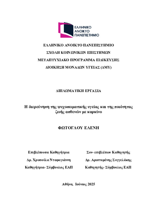 - Ψυχοσωματική Υγεία | Ποιότητα ζωής | Καρκίνος | Κοινωνική υποστήριξη | Ψυχολογικές επιπτώσεις